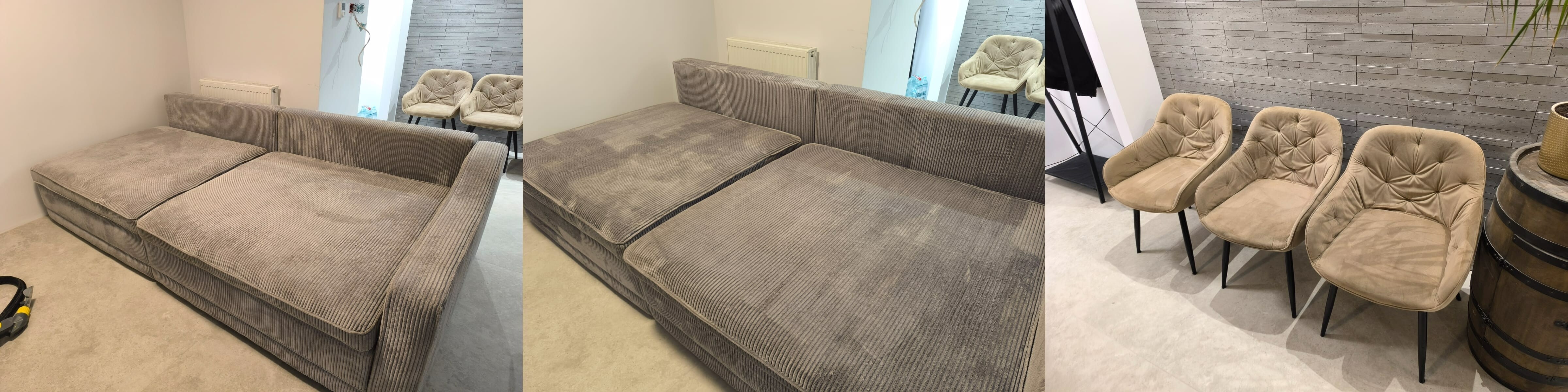 "On-site, we carefully examined the sofa and armchairs. The upholstery had minor stains, mainly from drinks and everyday use, but the overall condition of the furniture was very good. This allowed us to focus on a gentle yet effective refreshment."