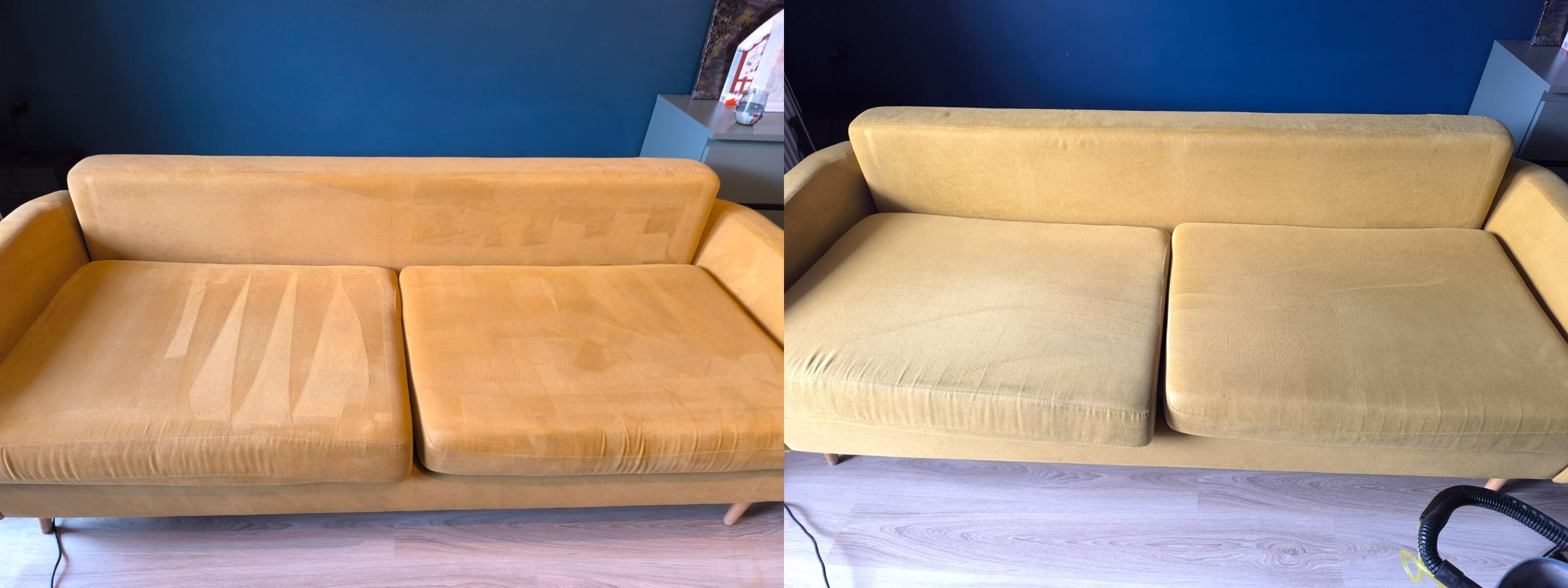 After cleaning, the sofa looked like new! The intense yellow of the fabric refreshed the entire living room, and the client was delighted with the result. As he admitted, such a service was the perfect solution for his furniture to look great again without the need to replace the upholstery.