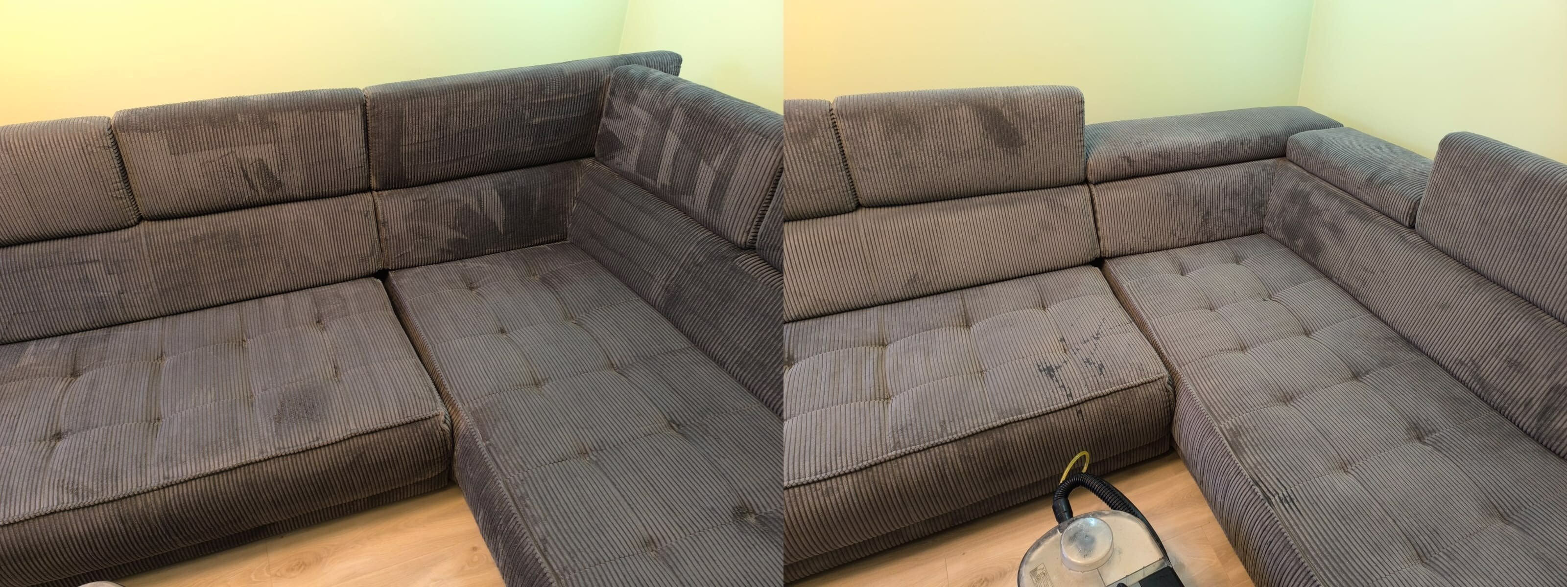 Pranie właściwe: Użyliśmy profesjonalnych środków czyszczących, które są bezpieczne dla ludzi, zwierząt i materiałów tapicerowanych. Za pomocą sprzętu Karcher, wyczyściliśmy narożnik, zwracając szczególną uwagę na wszelkie trudno dostępne miejsca.