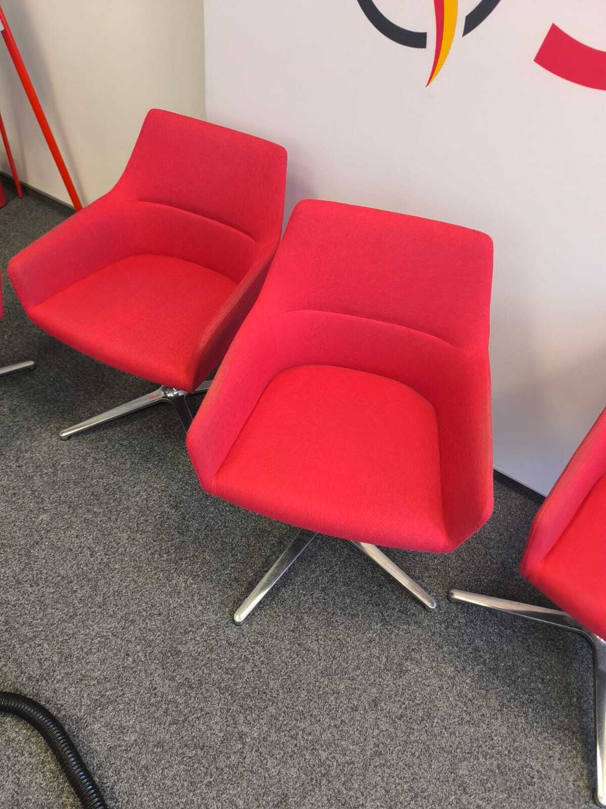 Pranie ekstrakcyjne, dzięki któremu zabrudzenia zostały wypłukane z wnętrza tkaniny, a krzesła odzyskały świeży wygląd i intensywny czerwony kolor.