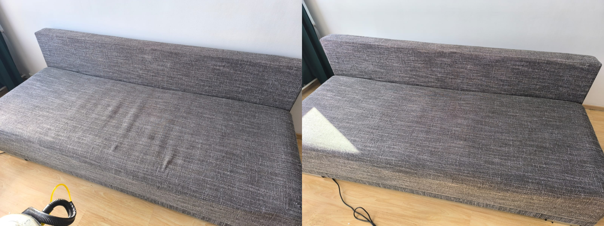 Pranie zakończyliśmy procesem suszenia, pozostawiając kanapę w idealnym stanie – czystą, pachnącą i gotową do użytku. Klientka była zaskoczona, jak duża różnica zaszła w wyglądzie mebla.