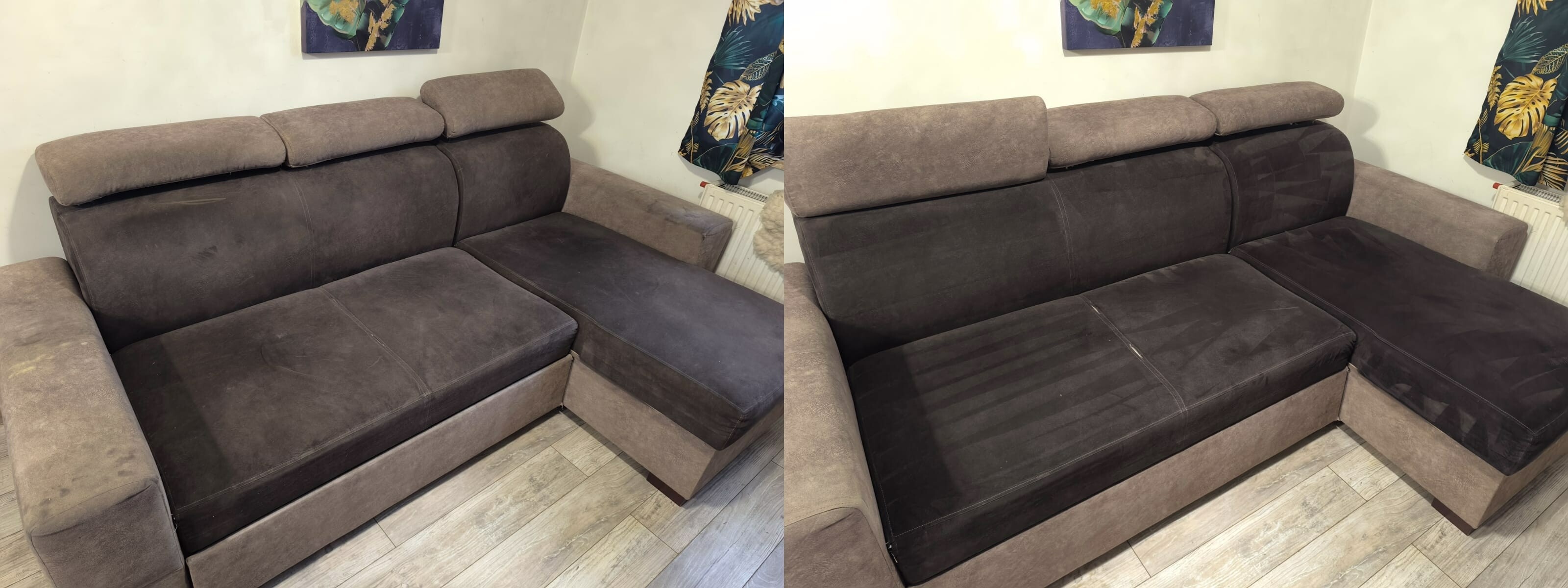 Narożnik był dość mocno zabrudzony, co nie jest zaskakujące w domu pełnym życia. Dzięki zastosowaniu sprawdzonych środków czyszczących udało się przywrócić mu dawny blask, a materiał stał się znów świeży i pachnący.